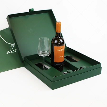 Брендированная коробка шкатулка с картонным ложементом под бутылку вина и бокалы